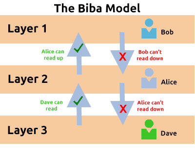 This model applies the rule to objects (data) and subjects (users) that can be summarised as "no write up, no read down". This rule means that subjects can create or write content to objects at or below their level but can only read the contents of objects above the subject's level.